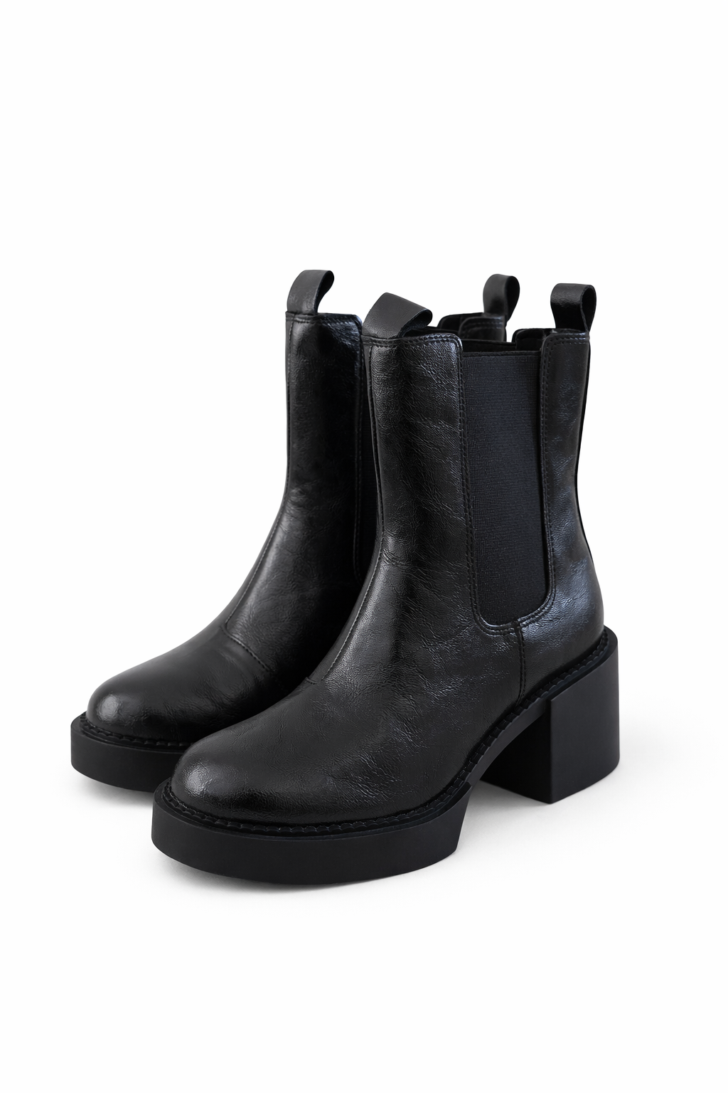 Sleek silhouette with elastic side panels and a squared toe, set on a sharp block heel.