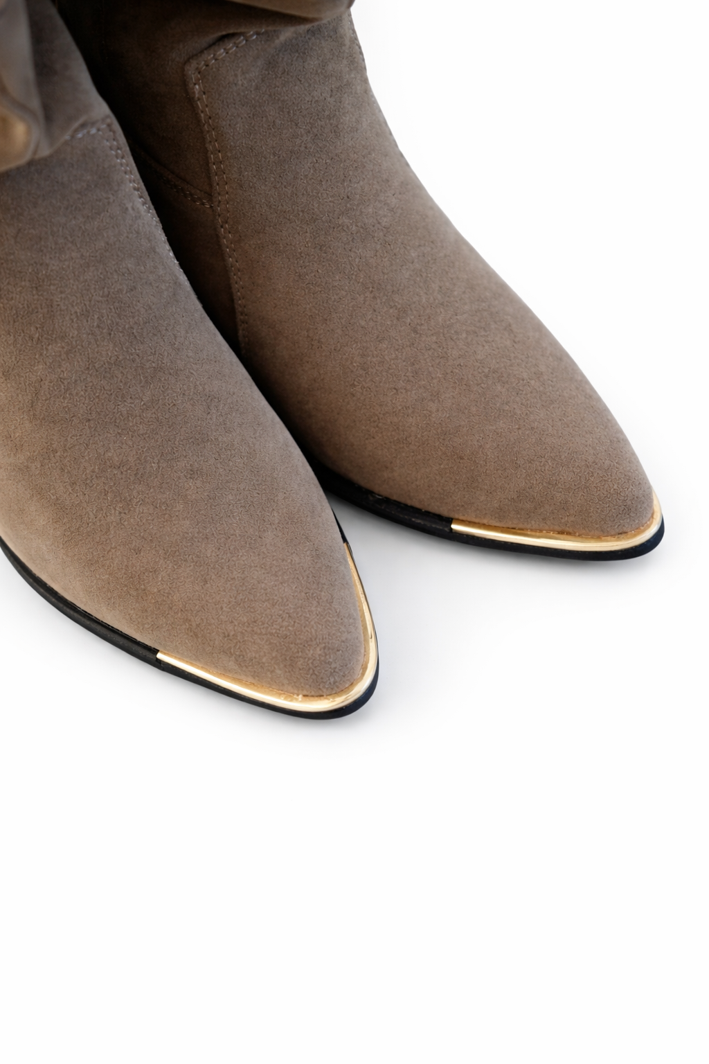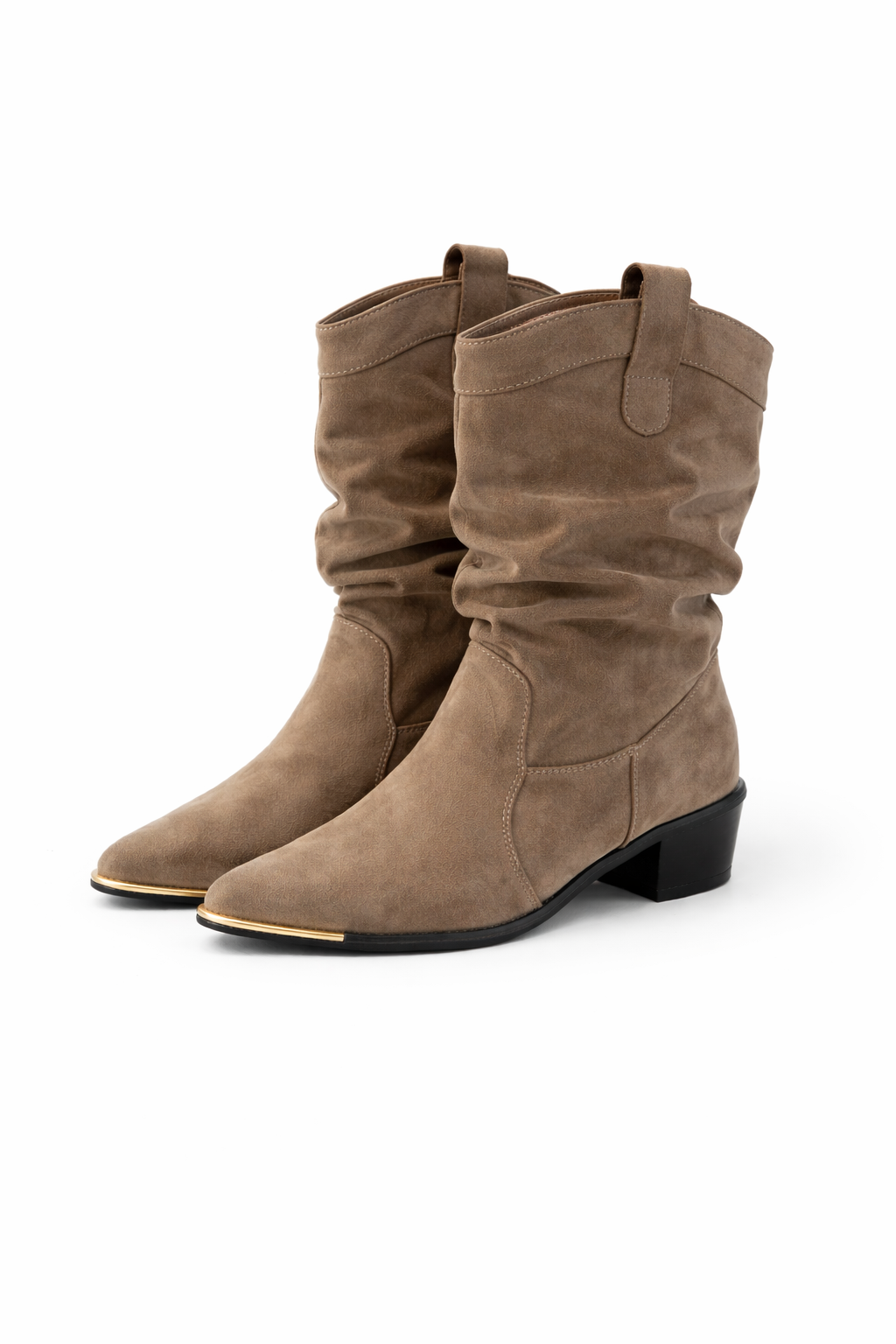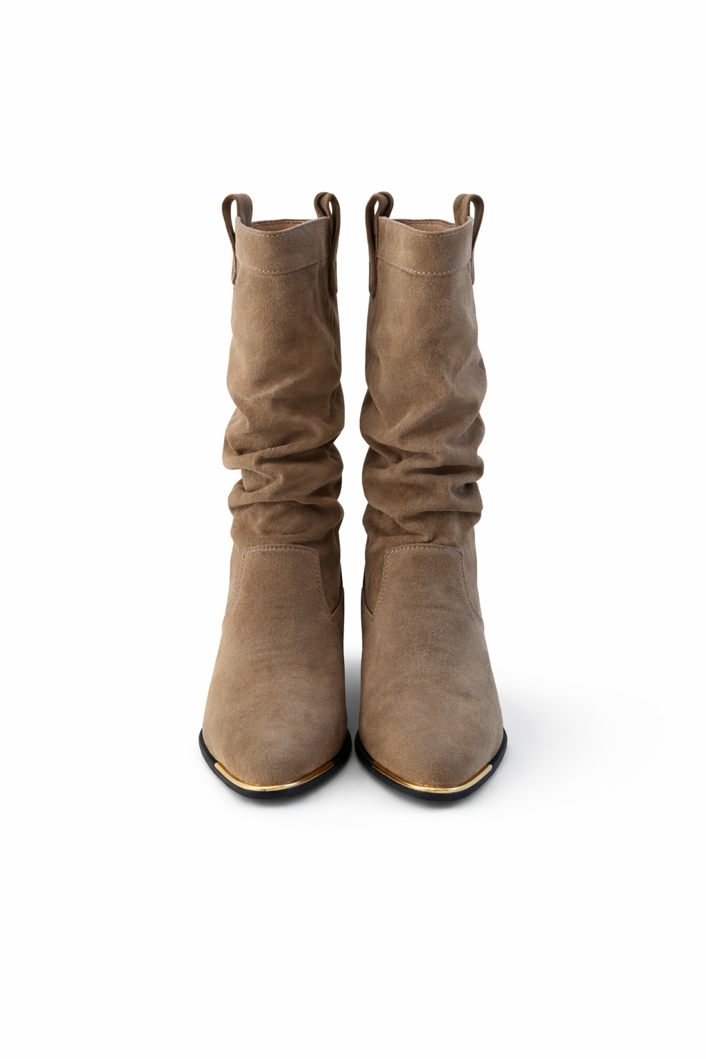 Relaxed shaft with natural folds and a softly squared toe, set on a low block heel.